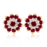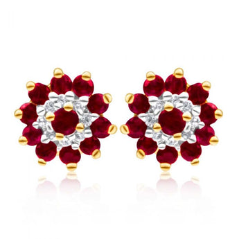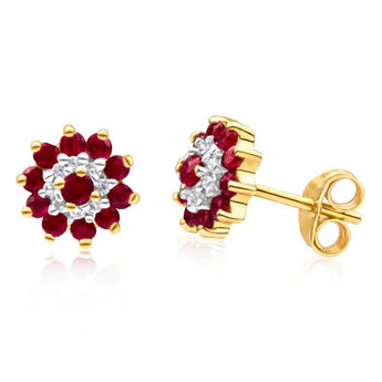9ct Yellow Gold Natural Ruby and Diamond Flower Cluster Stud Earrings