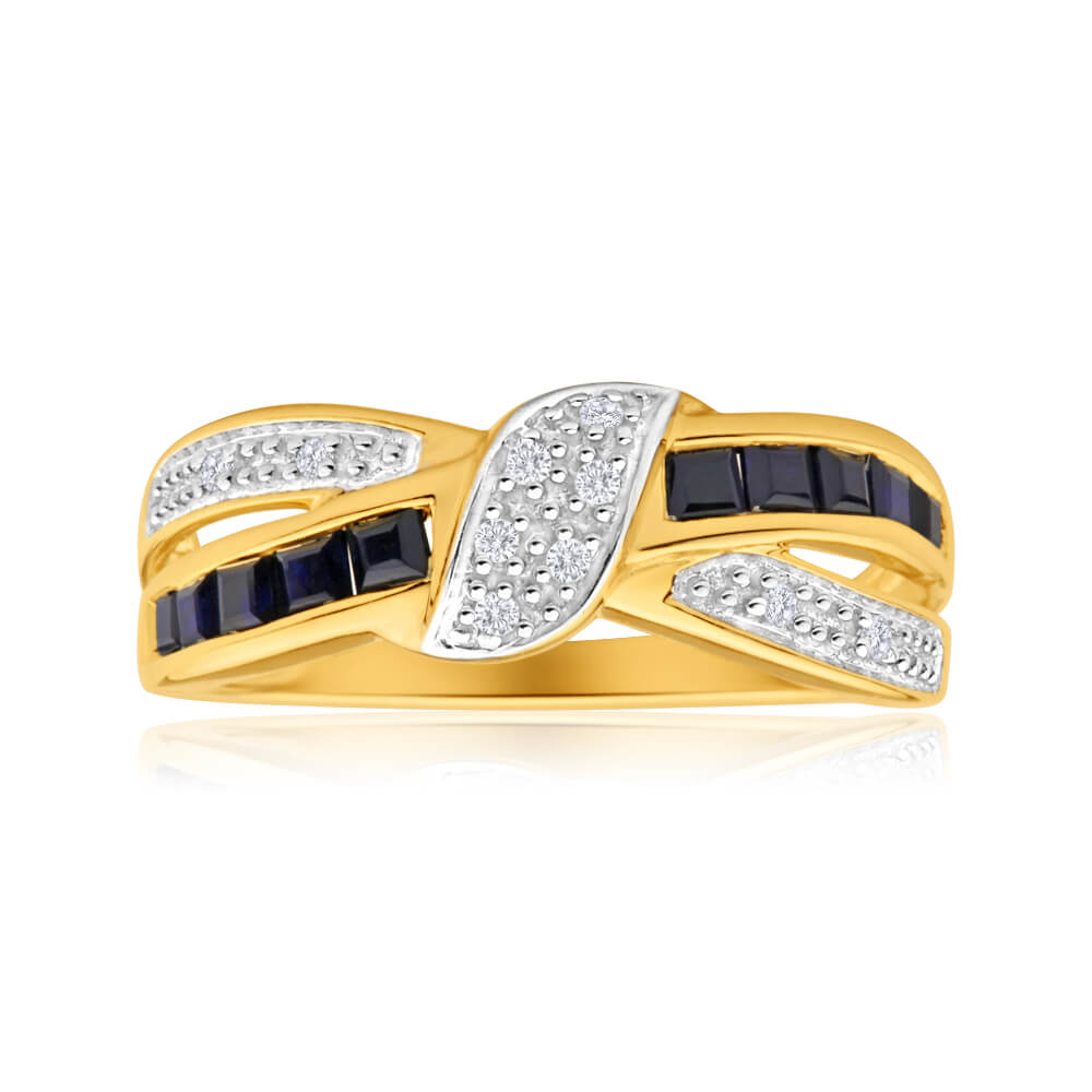 9ct Yellow Gold Natural Sapphire Diamond Crossover Ring