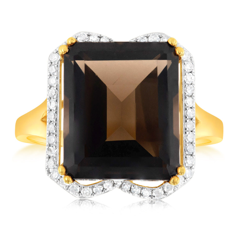 9ct Yellow Gold Natural Smokey Quartz And Diamond Ring