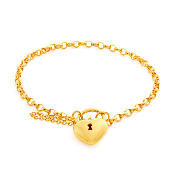 9ct Yellow Gold Oval Belcher Plain Heart Charm Padlock 19cm Bracelet