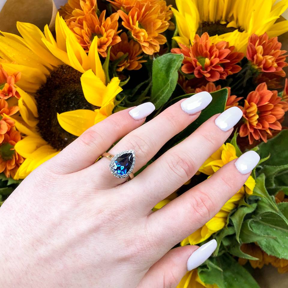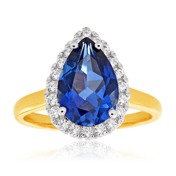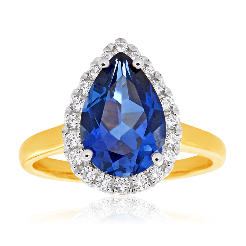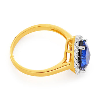 9ct Yellow Gold Pear Shaped Created Sapphire and Cubic Zirconia Halo Ring