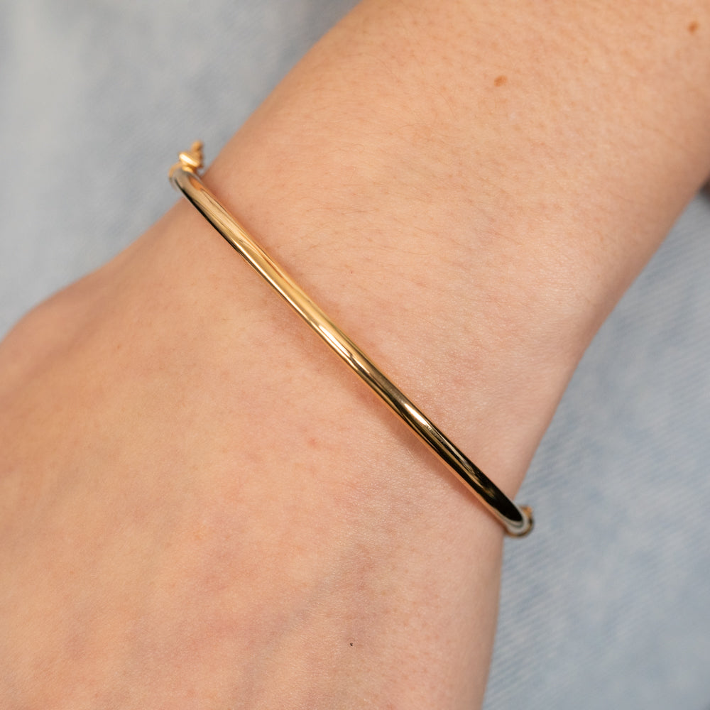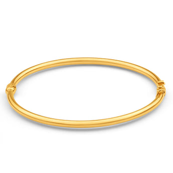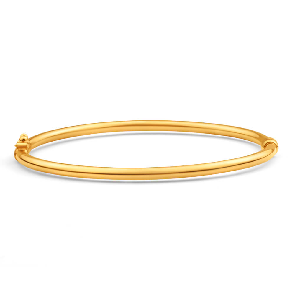 Simple but elegant, this plain hinge bangle is perfect for your everyday attire. The 9ct yellow gold filled bangle is 60mm.