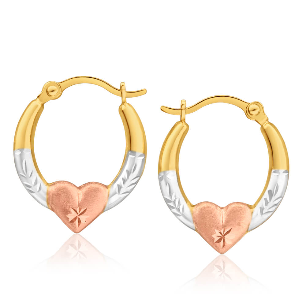 9ct Yellow Gold Silver Filled Three Tone Heart Hoop Earrings
