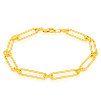 The 9ct Yellow Gold Silverfilled Fancy 19cm Bracelet is an exquisite piece of jewellery that effortlessly combines elegance with a touch of unique flair. Crafted with meticulous attention to detail, this bracelet showcases a beautiful fancy link design, adding a captivating and sophisticated touch to your wrist. Made with 9ct yellow gold and silver-filled materials, the bracelet offers both a luxurious aesthetic and exceptional durability. Its intricate design, comfortable 19cm length, and secure lobster claw clasp make it a versatile accessory suitable for both formal occasions and everyday wear. With its timeless appeal and lasting beauty, this bracelet is sure to become a cherished addition to your jewellery collection, adding a touch of elegance and individuality to any ensemble.