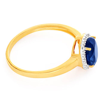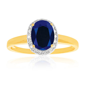 Introducing the exquisite 9ct Yellow Gold & White Gold Oval Sapphire and Diamond Ring—a harmonious blend of elegance and sophistication. This stunning ring features a yellow gold band that beautifully showcases a captivating oval-shaped created sapphire, the Birthday stone of September, held in place by four delicate claws and encircled by sparkling diamonds.
