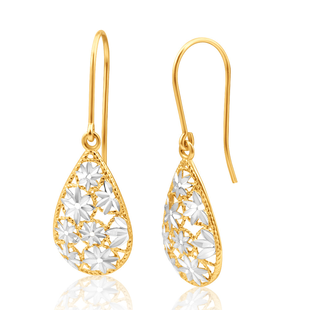 9ct Yellow Gold & White Gold Filigree Flower Tear Drop Earrings