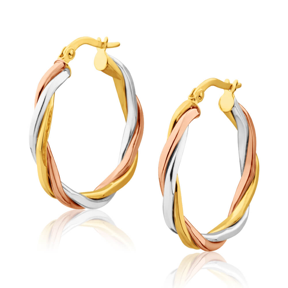 9ct Yellow Gold, White Gold & Rose Gold Twist 20mm Hoop Earrings