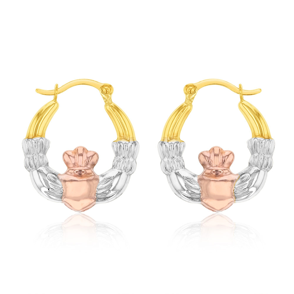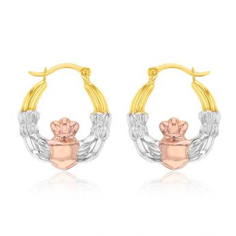 9ct Yellow Red and White Gold Three Tone Claddagh Hoop Earring