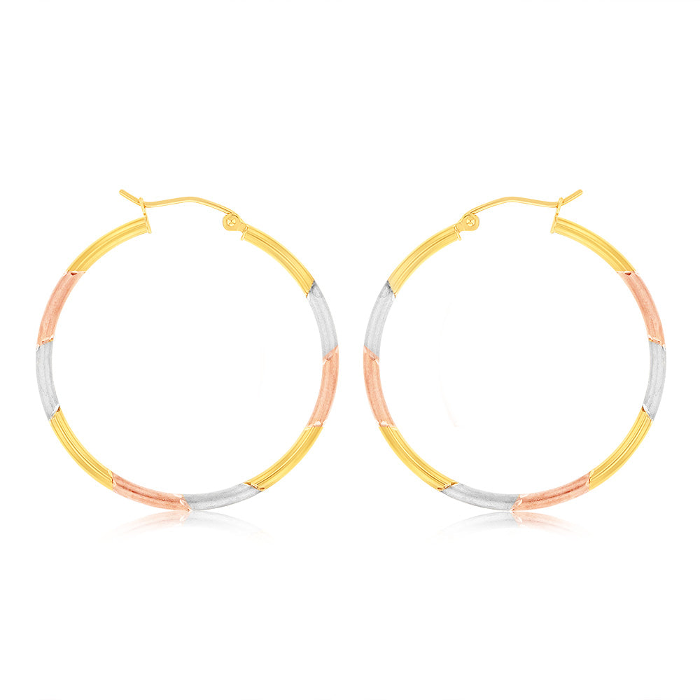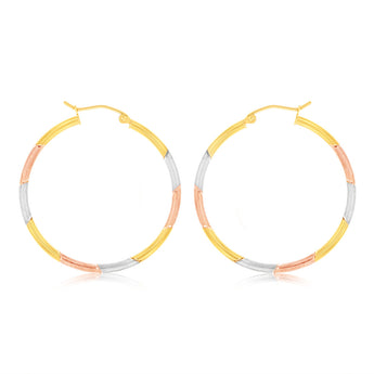9ct Yellow Rose And White Gold Tri Colour Super Light Diamond Cut Tube Hoop Earrings