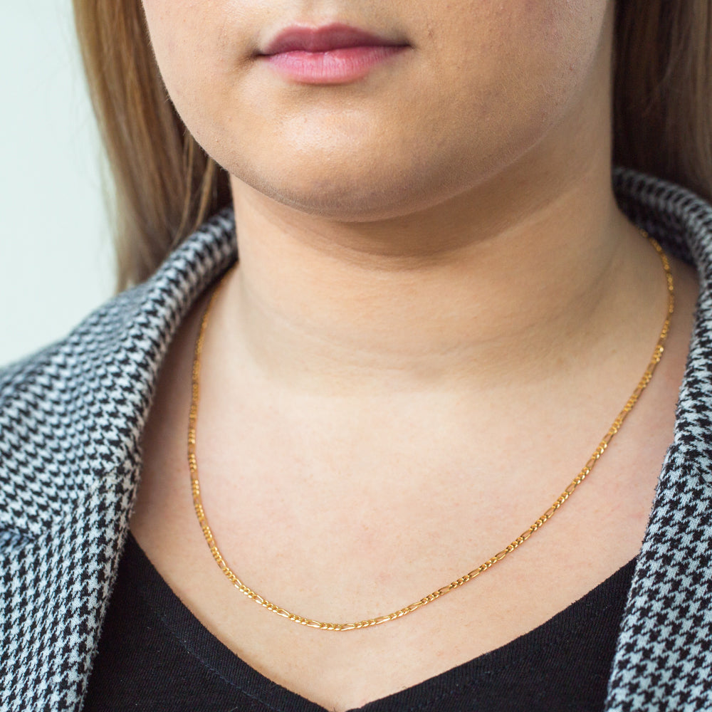 This intricate 9ct Yellow Gold 55cm Figaro Chain will certainly add some feature to your outfit. The beauty of the chain appears in the striking figaro design which showcases one elongated oval link followed by three smaller circular links. It sits perfectly hovering above the chest in natural contour to the neck. There is nothing shy about this piece, it simply radiates in golden fluency with every intention of making a statement. A simply stunning necklace that should always accompany a woman of substance.