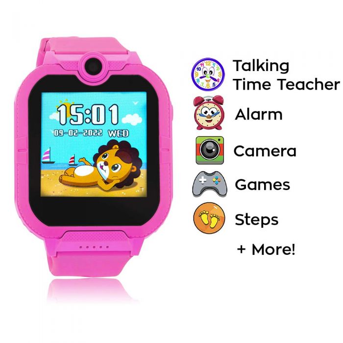 The watch offers 12 predefined dials, a digital camera with storage space for photos and videos. a built-in stopwatch, alarm, calendar, step counter and voice recorder. It also has a handful of inbuilt games to keep your little one occupied too!