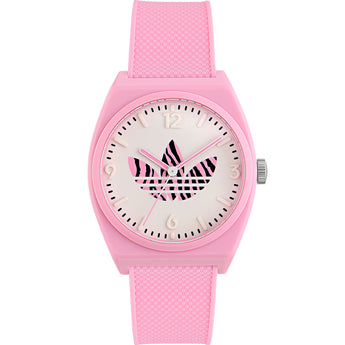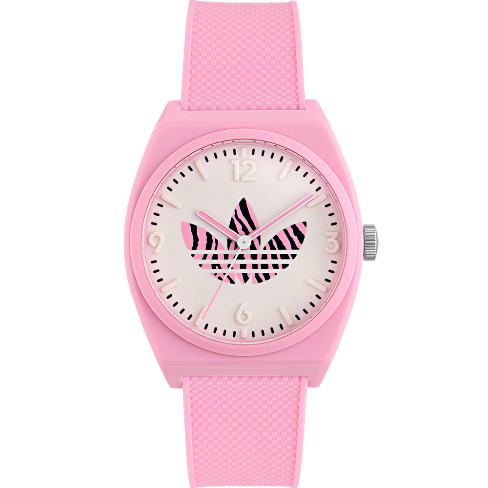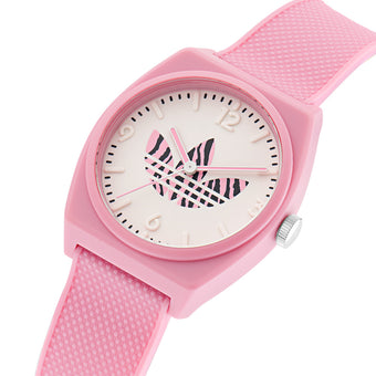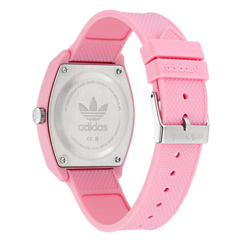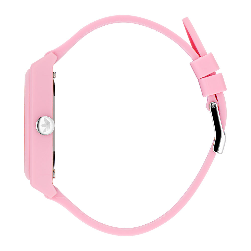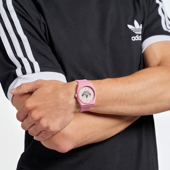 The Adidas Originals Street Project Two GRFX AOST23553 is designed for enthusiasts of pink hues. It features a resin case and strap. The watch is resilient against significant splashes of water.