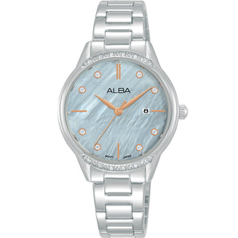 Enhanced with a date display for practicality, the dial is further embellished with crystals both on the time markers and bezel, totalling 20 stones, adding a touch of sparkle and sophistication.