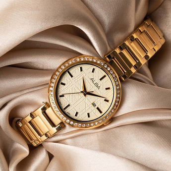 Enhancing its allure, the AH7X36X1 is adorned with 50 crystals around the dial, adding a touch of sparkle and sophistication. Combined with a practical date display, this timepiece blends luxury with functionality, appealing to those who seek both style and practicality in their watch.