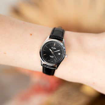 With its 27mm stainless steel case and paired with a comfortable leather strap, this watch offers a refined and classic look suitable for various occasions. The screw back case design enhances durability, ensuring longevity and robustness.
