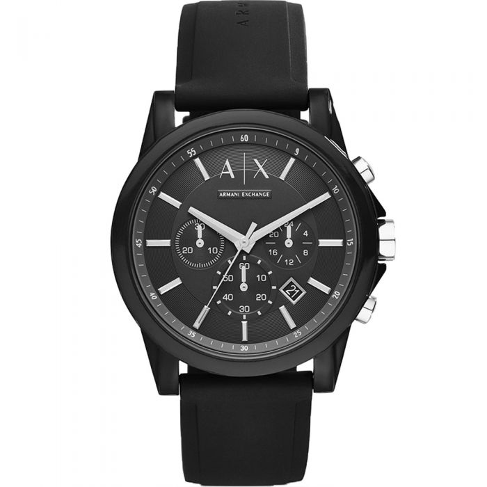 Armani Exchange Outerbanks AX1326 Black Chronograph, Sleek and stylish the AX1326 has been designed by Armani exchange for their Sport range. A smooth black silicone strap is the support of this wristwatch. A sleek black head casing is home to a stark black analogue display.