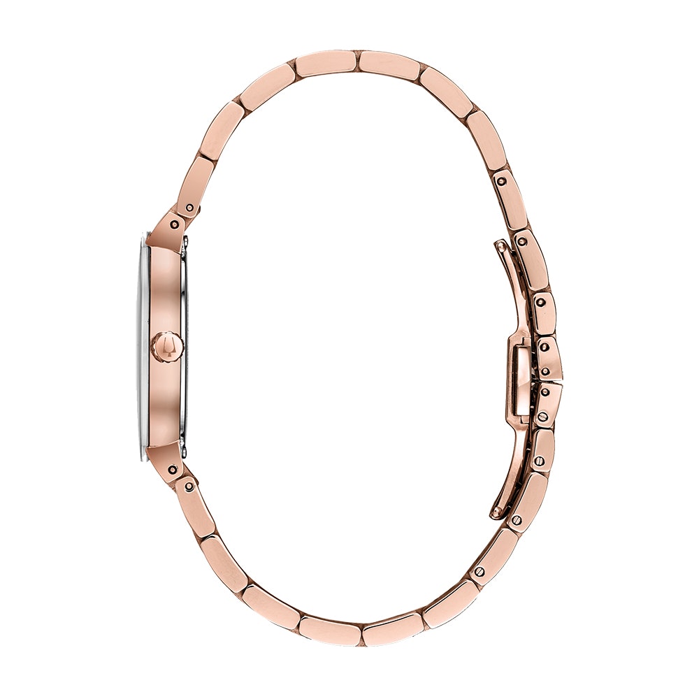 • Screw-back case, rose gold-tone stainless bracelet with double-press deployment closure.