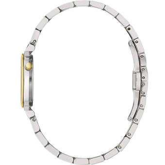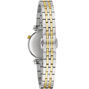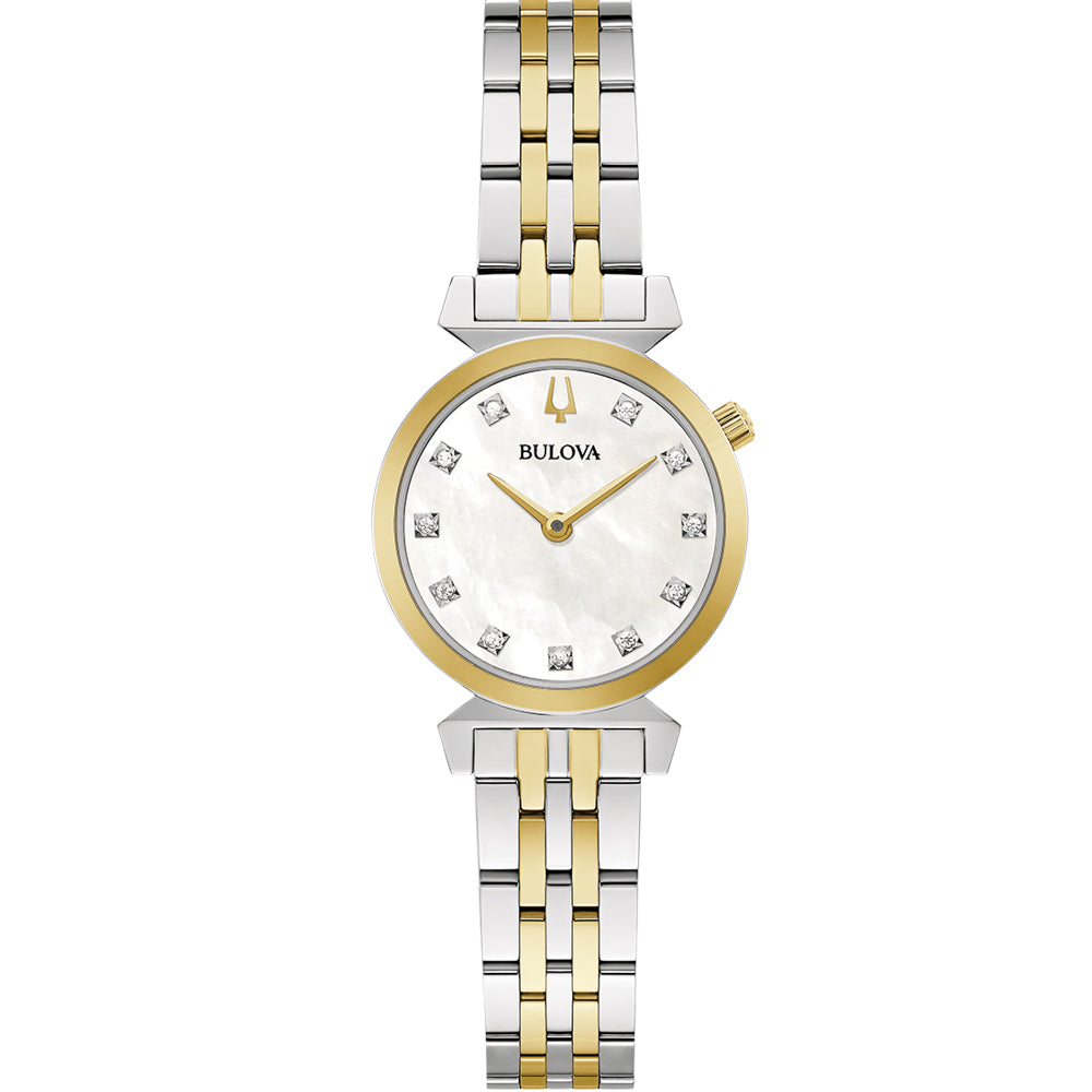 Inspired by Bulova's heritage, the petite two-tone stainless-steel Regatta showcases a lustrous white mother-of-pearl dial adorned with 11 diamonds. It features signature design details, including the crown at the 2 o'clock position and distinct angled lugs. The 24mm case, with a slim 6mm thickness, is complemented by flat sapphire crystal and a quartz movement. Water-resistant up to 30 meters, this watch combines classic elegance with practical durability.