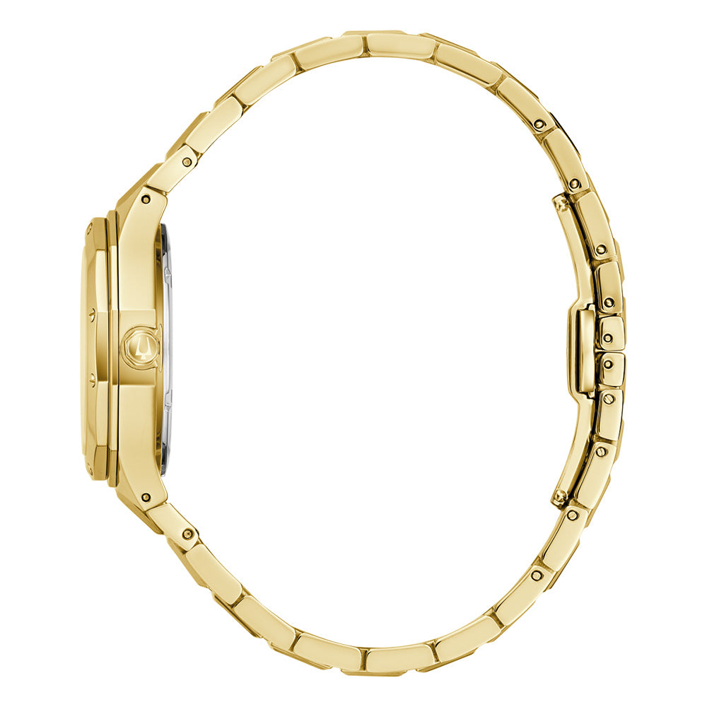 Completing the look is a chamfered 3-link gold-tone bracelet, finished with a blend of brushed and polished surfaces and secured with a push-button deployant clasp. Both modern and sophisticated, this timepiece brings elevated style to any occasion.