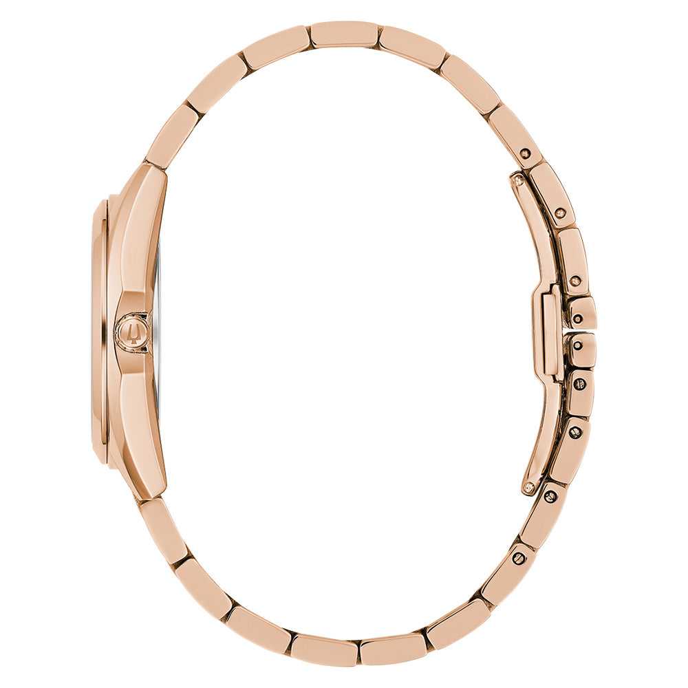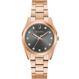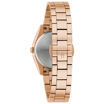 A simple yet stylish watch, this Bulova Classic Surveyor 11 Diamonds Rose Stainless Steel watch has refined details. The watch is crafted in the blush tones of rose gold that make up the band and the case to create a luxurious feel. A round dial with a black sunray dial, the two colours contrast each other beautifully. Sparkly stones are the hour markers and really give the piece a tone of glamour. Enjoy the impeccable timekeeping of Bulova that will keep you on time all day long.