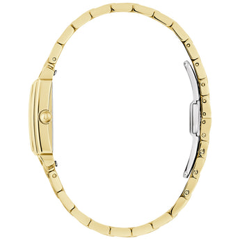 The lustrous mother-of-pearl dial is adorned with gold-tone Roman numerals and hands, offering a timeless and graceful aesthetic. A coordinating five-link gold-tone stainless steel bracelet completes the look, featuring a deployant clasp with pushers for a secure fit and latched spring bars for easy release.