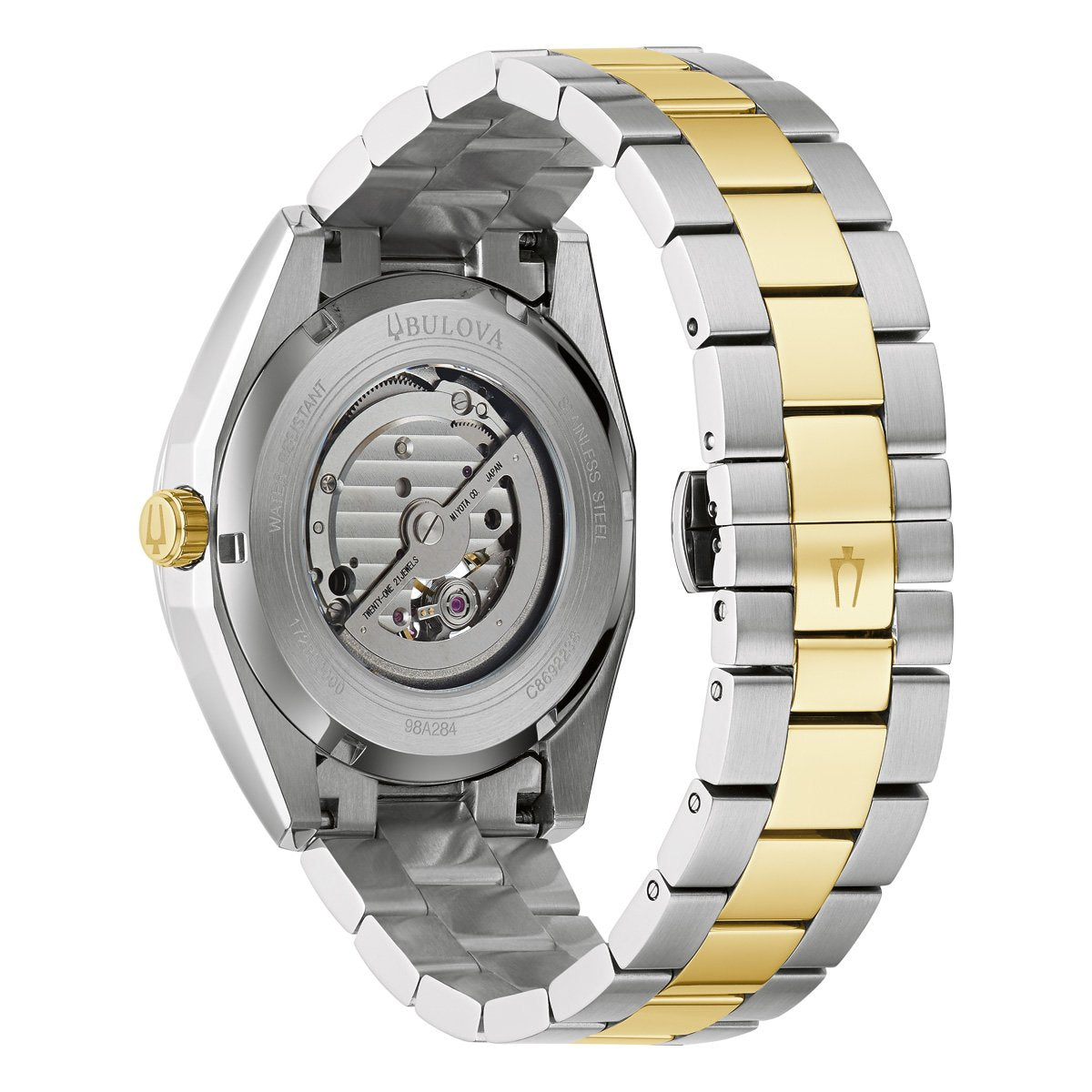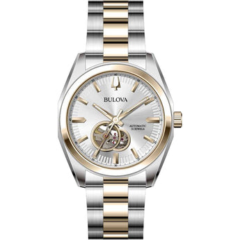 The Bulova Surveyor 98A284 Automatic exudes sophistication with its two-tone stainless-steel case and bracelet. The sleek silver dial features an open aperture that highlights the 21-jewel automatic movement. This timepiece, with a 42mm case and 11.65mm thickness, is protected by flat mineral crystal and offers water resistance up to 30 meters, blending elegant design with practical functionality.