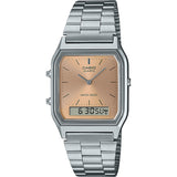 The watch features a 38.8 × 29.8 × 8.1mm case size and weighs just 47g, making it comfortable and easy to wear. The resin/chrome-plated case and bezel provide durability, while the stainless-steel band adds a refined touch. It is water-resistant and powered by a battery with an estimated life of 3 years (SR920W). The resin glass protects the dial, and the watch includes features such as world time with dual time zones, a stopwatch, an alarm with an hourly signal, and an auto-calendar for months with 28 days in February. It maintains an accuracy of ±30 seconds per month and offers both 12-hour and 24-hour time formats. The regular timekeeping display includes two analog hands (hour, minute) and digital information for the hour, minute, second, PM indicator, month, date, and day.