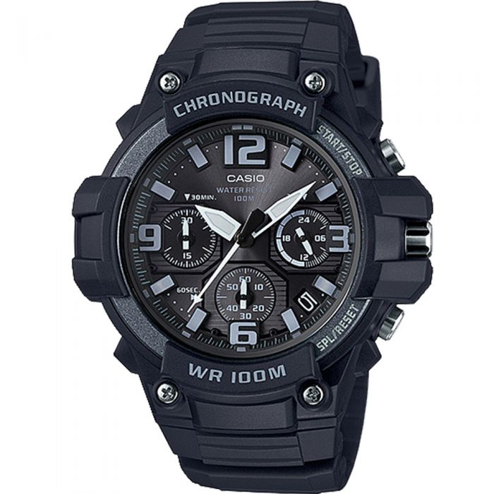 - Analog: 3 hands (hour, minute, second), 3 dials (stopwatch minutes, stopwatch seconds, 24-hour)