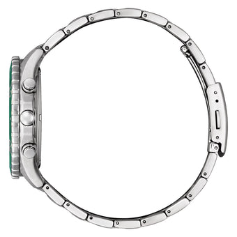 This Citizen Eco-Drive AT2386-55E showcases a stainless-steel case and bracelet, complemented by a black dial and a distinctive green bezel that adds to its standout appeal. It includes a date display, is water-resistant up to 100 meters, has a case size of 43mm, and features Citizen Eco-Drive technology—operated by any light source, ensuring it never requires a battery.