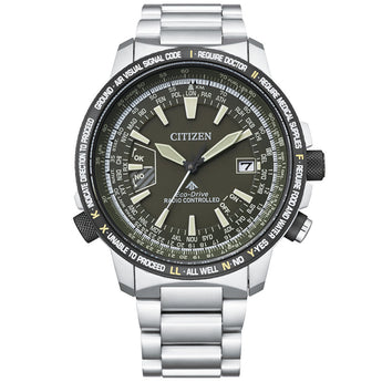 For enhanced performance, this model includes a bezel emergency sign, perpetual calendar, radio-controlled timekeeping, world time in 26 cities, an aviation slide rule inner ring, and a cockpit dial design. Powered by Eco-Drive technology, it requires no battery, drawing power from any light source.