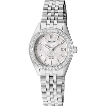 Genuine luxury speaks for itself, effortlessly drawing attention in a natural manner, and this sentiment perfectly encapsulates this exquisite Quartz timepiece. Featuring sophisticated silver tones that harmonize seamlessly with a captivating mother-of-pearl dial and bezel adorned with dazzling crystals, it leaves an enduring impression of timeless elegance.