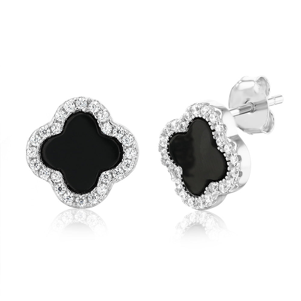 Clover Black Agate & White Cubic Zirconia Stud Earrings in Sterling Silver Rhodium Plated