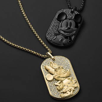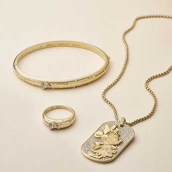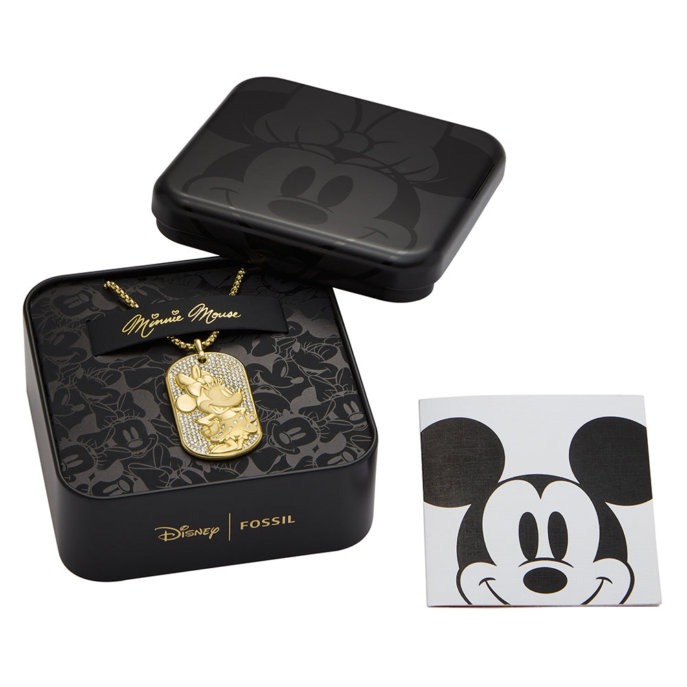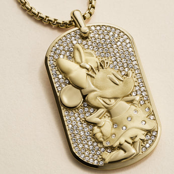 The Disney Minnie Mouse Clear Glass Crystal Dogtag Pendant on Chain in Gold Plated Stainless Steel is a delightful and stylish piece of jewellery that captures the essence of Minnie Mouse's timeless charm. This dogtag pendant features clear glass crystals adorned with Minnie Mouse's iconic bow and silhouette, adding a touch of Disney magic to your ensemble.