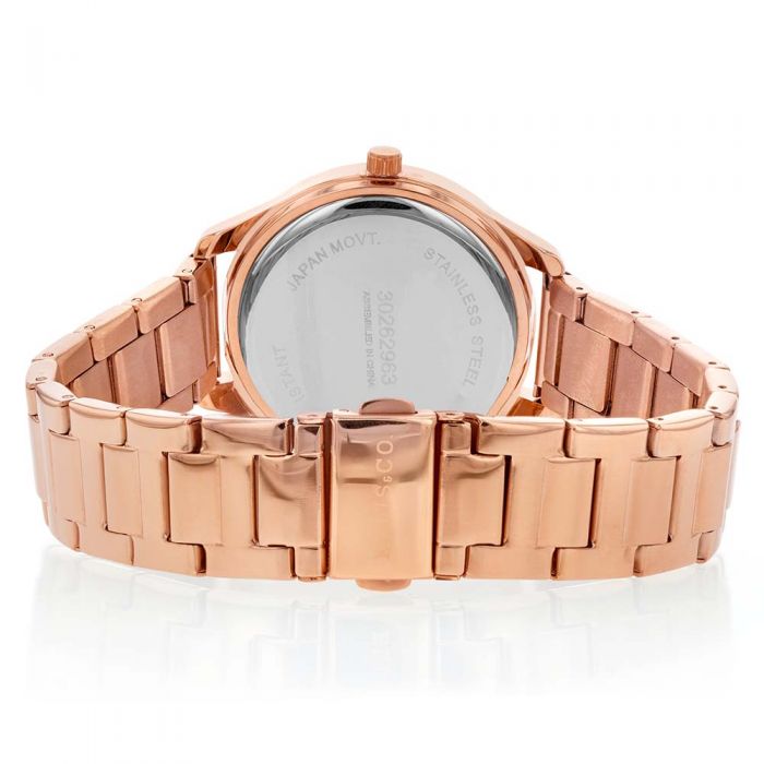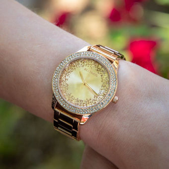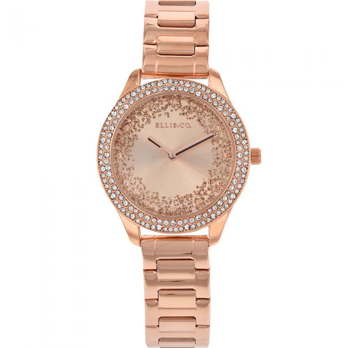 Add glamour to your life with this stunning Ellis & Co Eva Glitz Rose Gold Plated Womens Watch that you will adore. Crafted in rose gold stainless steel with hues of pink and yellow, this watch is durable yet feminine. The bezel features a frame of glittering stones that sparkle in the light. The dial has a minimalistic design with no indexes, instead a gradient of glitter circles the watch against a brushed rose gold finish. This watch will elevate any outfit and take your look to the next level.