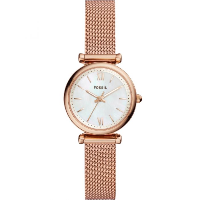 • This 28mm Carlie Mini features a mother-of-pearl dial with Roman numerals, three-hand movement and stainless steel rose gold-tone mesh bracelet