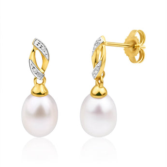 Freshwater Pearl and Diamond Drop Earrings in 9ct Yellow Gold