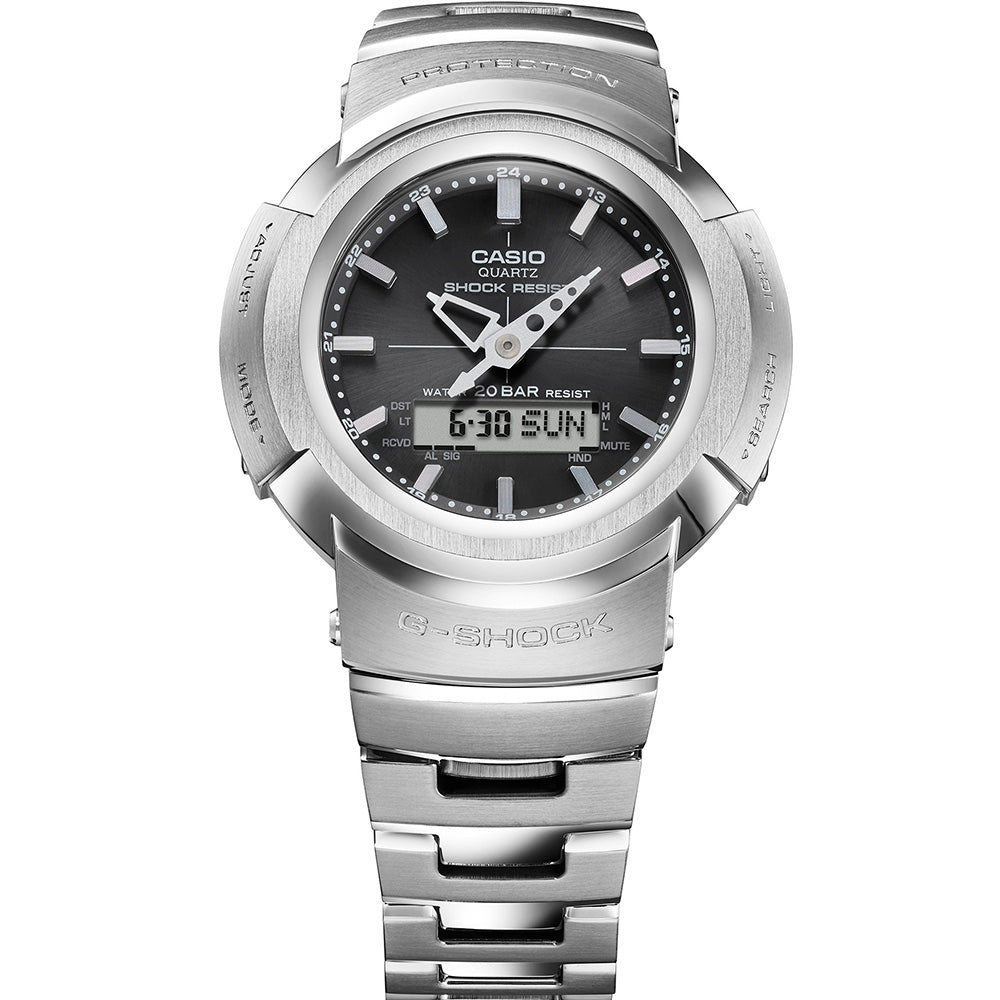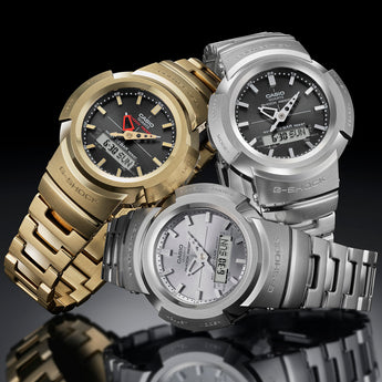 The AWM500D-1A, based on the AW-500, G-SHOCK's first analogue-digital combination timepiece that was released in 1989, these new full-metal models employ hard stainless-steel material for their bezels and bands.