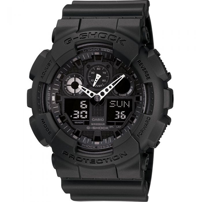 Introducing the G-Shock GA100-1A4 Watch, a robust timepiece engineered for both style and functionality. With dimensions of 55 × 51.2 × 16.9mm and a weight of 70g, it strikes the perfect balance between durability and comfort. Crafted with a resilient resin case, band, and bezel, it's designed to withstand shocks and magnetic interference, ensuring reliability in challenging environments. Dive into adventures with confidence, as it boasts water resistance up to 200 meters. Powered by a CR1220 battery, enjoy approximately 2 years of continuous use. Its mineral glass offers scratch resistance, maintaining clarity over time. Stay connected to global time zones with world time functionality, featuring 29 time zones and 48 cities, along with essential features like stopwatch, timer, and 5 daily alarms with a snooze option. The full auto-calendar extends to 2099, while accuracy is guaranteed at ±15 seconds per month. Choose between 12/24-hour formats for convenience. The combination of analogue and digital displays provides a comprehensive view of time and essential data. Embrace durability and precision with the G-Shock GA100-1A4, the ultimate companion for your active lifestyle.
