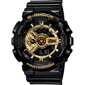 The G-Shock GA110GB-1A brings serious durability in a black and gold design that works for tough everyday wear. This men's watch combines an analogue-digital display with rugged resin construction, ready to handle whatever your day throws at you. With 200m water resistance and shock protection, it's built to keep ticking through active lifestyles.