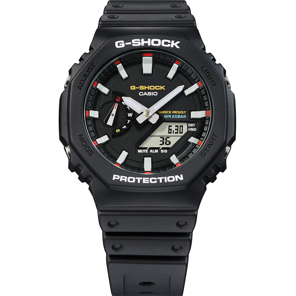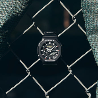This model includes world time across 31 time zones, covering 48 cities plus coordinated universal time, with daylight saving on/off. It also offers a 1/100-second stopwatch, countdown timer, 5 daily alarms, hourly time signal, and a full auto-calendar that extends to 2099. Regular timekeeping is displayed with analog hands (hour and minute, with the minute hand moving every 20 seconds) and a digital readout for hour, minute, second, pm, month, and date. The GA2100RL-1A has an accuracy of ±15 seconds per month and an impressive 3-year battery life on two SR726W batteries.