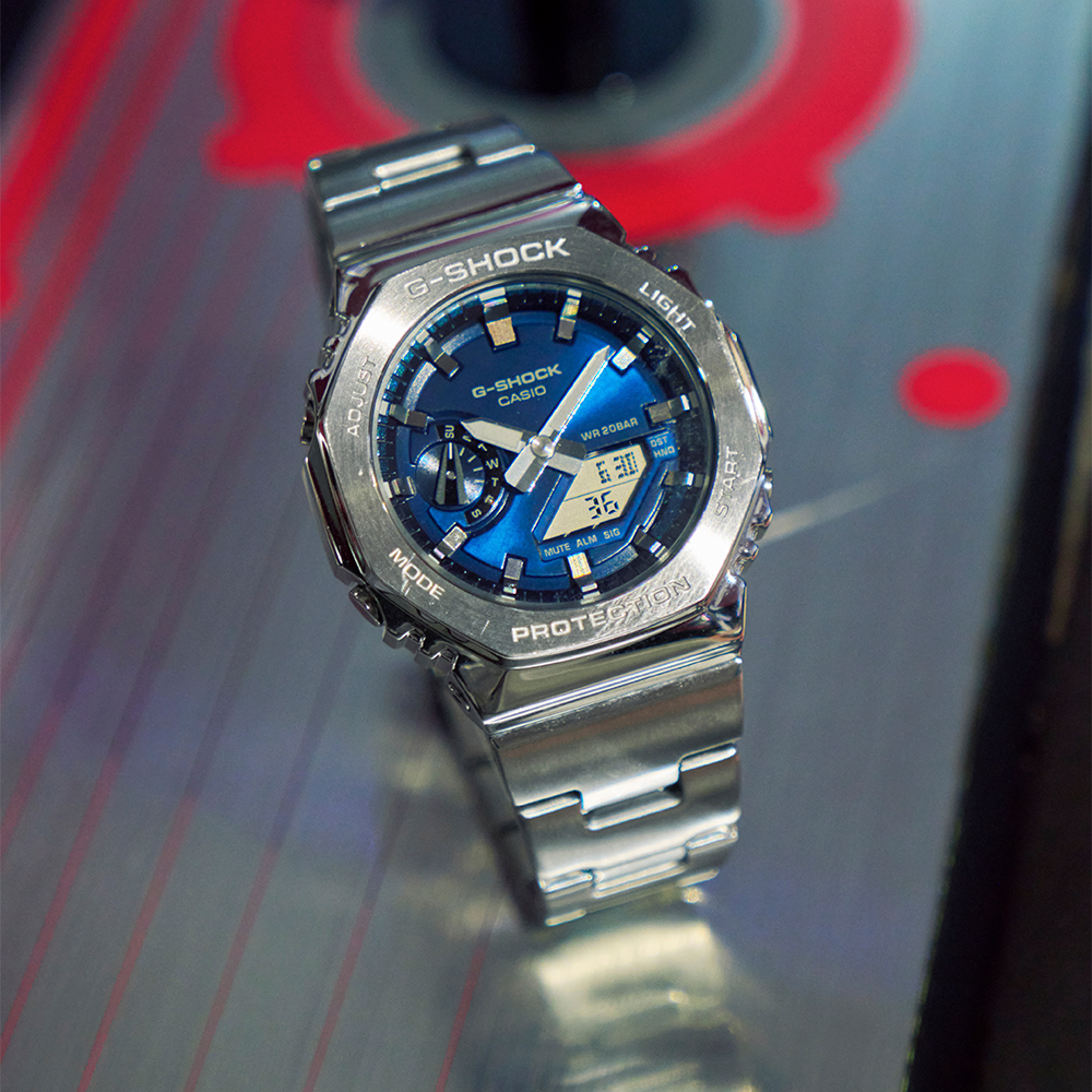 The GM2110D-2B stands out with its slim 11.8mm profile, making it the slimmest of all G-SHOCK combination models. Its high-rigidity glass-fibre-reinforced fine resin case is paired with a meticulously forged and polished octagonal stainless-steel bezel, offering a robust yet stylish look.