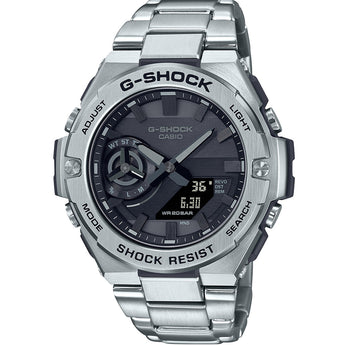 The G-Shock GSTB500D-1A1 blends bold style with advanced technology, featuring a silver stainless-steel case and bracelet with a black dial for a refined yet rugged look. Its Carbon Core Guard structure ensures strength and shock resistance, while the slim 12.8mm profile and downsized button guards offer a comfortable, easy-to-wear design.