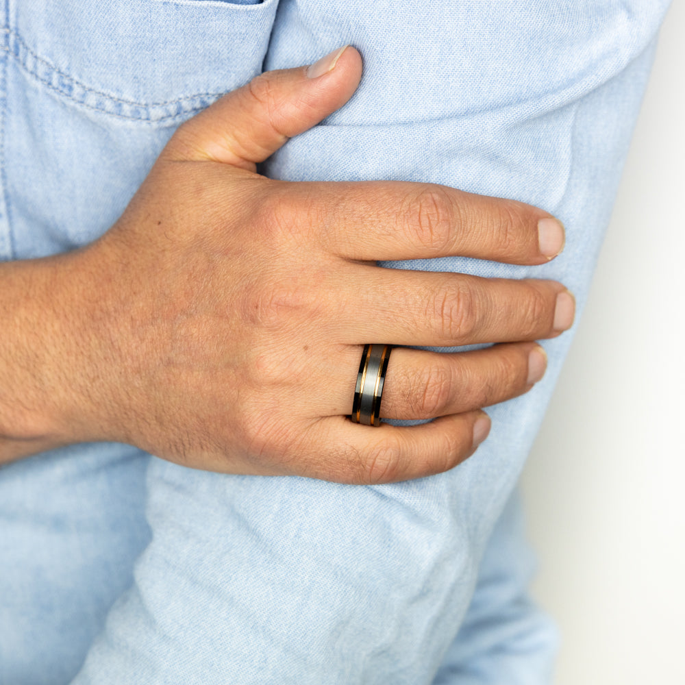 Grey And Black Strips 8mm Wide Rose Gold Tungsten Ring