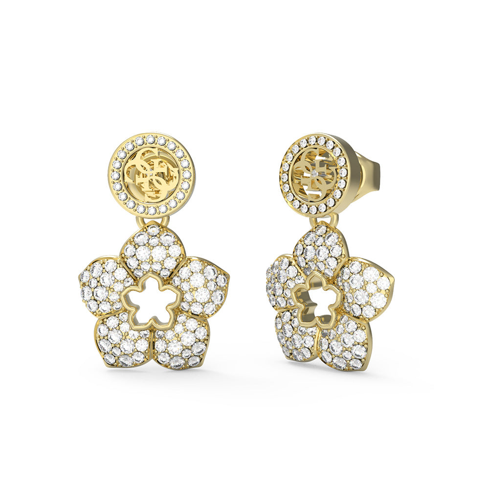 Guess Gold Plated Stainless Steel 4G And Pave Flower Drop Earrings