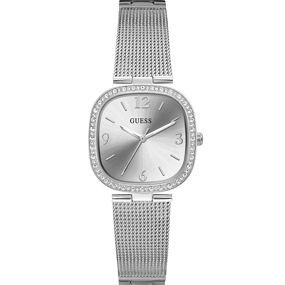 Introducing the Guess GW0354L1 Tapestry Watch, a symbol of refined elegance and luxury. This exquisite timepiece boasts a sleek silver-tone stainless steel case adorned with a dazzling crystal-set bezel, exuding sophistication. The silver sunray dial adds a shimmering touch, complemented by a self-adjustable mesh bracelet that enhances comfort and style. With precise quartz movement and a chic 32mm rounded square case design, it embodies modern femininity and timeless allure. Protected by a durable mineral crystal and offering water resistance up to 30 meters, the Guess Tapestry watch is an essential accessory for the discerning woman who values both fashion and functionality.