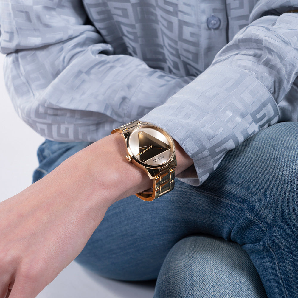 Crafted for comfort and durability, the watch includes a gold-tone stainless steel bracelet that complements its stylish design. Water-resistant up to 30 meters, it offers practicality for daily activities and occasional exposure to water.