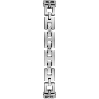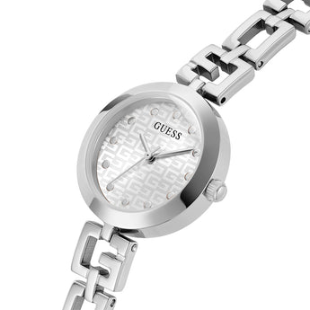 The bracelet's unique 'G' block connections on either side of the case and the repeating 'G' block tonal dial highlight Guess's distinctive design language. Self-adjustable 'G' links ensure a customized fit, enhancing both comfort and style.