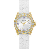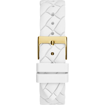 With a 34mm case size, the GW0585L2 strikes a balance between boldness and wearability, making it suitable for various wrist sizes and occasions. The gold tone case and GUESS logo detailing on the dial add to its refined aesthetic, while the textured band enhances its visual appeal.