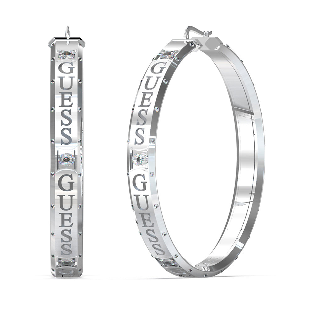 Guess Rhodium Plated Stainless Steel 55mm Logo Round Hoop Earrings