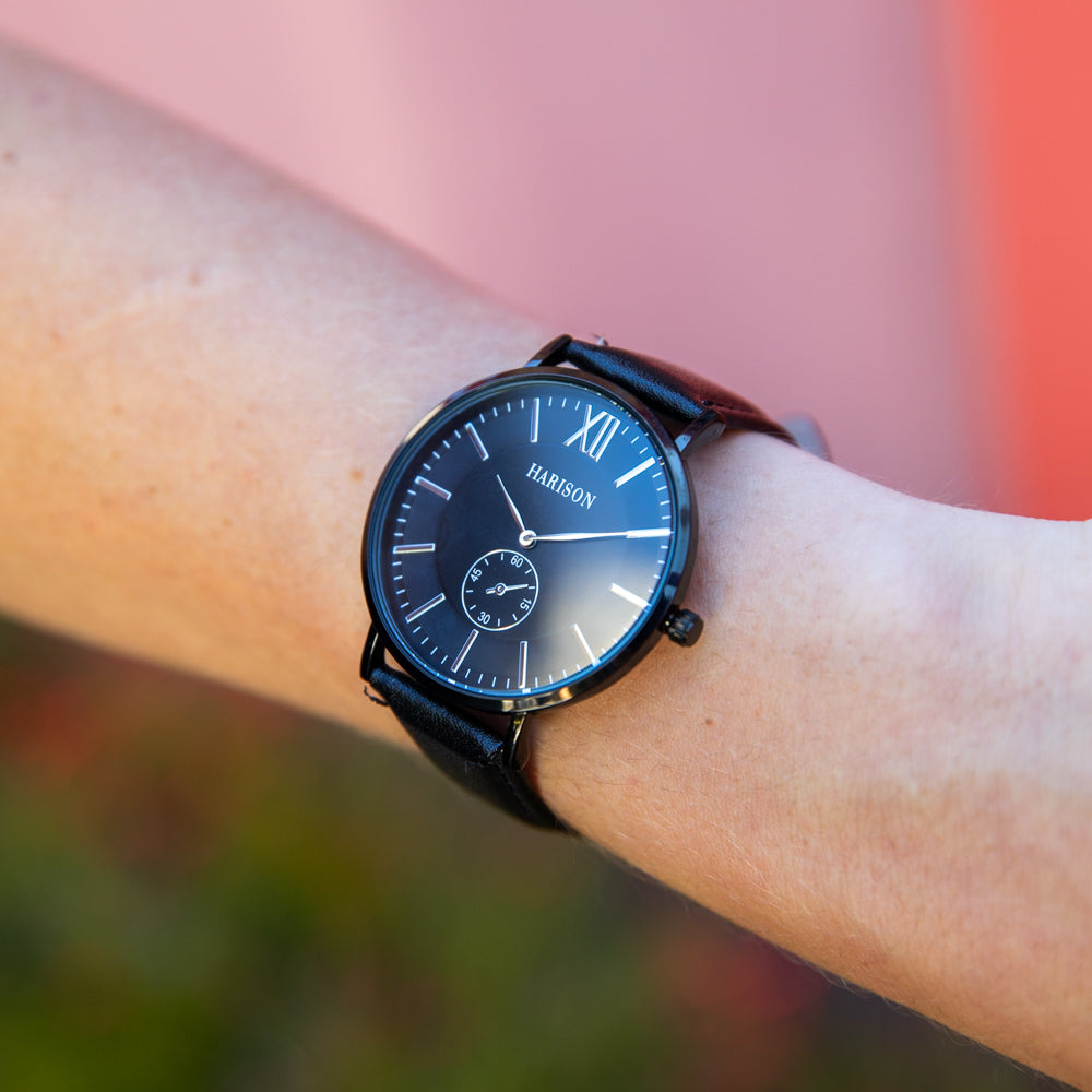 It features a 40mm black case with a matching black dial accented by a decorative sub-dial for subtle detail. The black strap offers a comfortable fit and a sleek finish. Built with durable mineral glass and water resistance up to 30 meters, this watch is perfect for everyday wear. Please note: the sub-dial is decorative only.